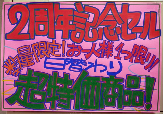この大きな目立つポップが目印です 日替わりのSALE品も、2周年のお祝いSALE品も ほぼこのポップの周りに置かれてます 大事なことなので、さらにもう一度お伝えします |